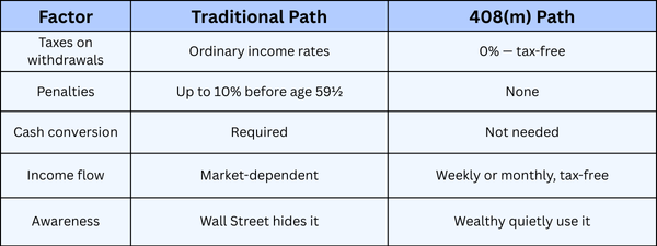 This is why the wealthy rarely panic during downturns. While others scramble, they rely on built-in mechanisms like 408(m) to preserve — and even grow — their wealth.