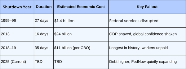 Shutdowns aren’t new. But the difference today is convergence: historic debt, a fragile dollar, banks under pressure, and digital rails already in place for FedNow.