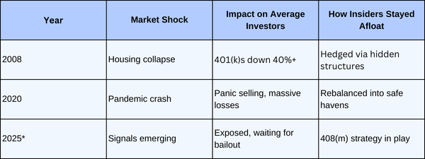 History doesn’t repeat exactly, but it rhymes. In 2008, millions “held tight” and watched years of savings evaporate. In 2020, the story repeated in a matter of weeks. Each time, the same pattern emerged: insiders surfaced stronger, while ordinary investors scrambled.