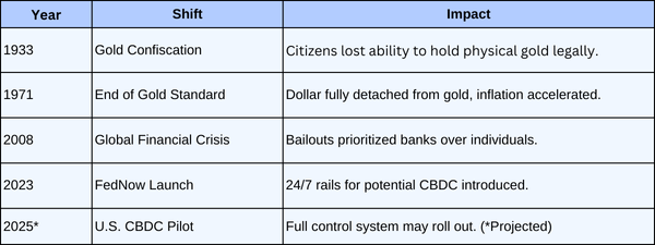 History teaches us that major monetary shifts don’t come with warning sirens. In 1933, Americans woke up to gold confiscation. In 1971, Nixon ended the gold standard in a single televised address. In 2008, banks collapsed while politicians promised “stability.”